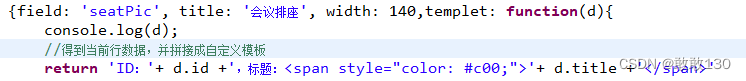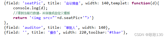 // url: 'user.action?methodName=list', //请求地址height: 340, //自定义高度loading: false, //是否显示加载条(默认 true)cols: [[ //设置表头{field: 'id', title: '会议编号', width: 120},{field: 'title', title: '会议标题', width: 120},{field: 'location', title: '会议地点', width: 140},{field: 'startTime', title: '开始时间', width: 220},{field: 'endTime', title: '结束时间', width: 120},{field: 'meetingstate', title: '会议状态', width: 120},{field: 'seatPic', title: '会议排座', width: 140},{field: 'auditor', title: '审批人', width: 140},{field: '', title: '操作', width: 220,toolbar:'#tbar'},]]});//在页面中的中必须配置lay-filter="tb_goods"属性才能触发属性!!!table.on('tool(tb)', function (obj) {row = obj.data;if (obj.event == "seat") {layer.msg("排座");}else if(obj.event == "send"){layer.msg("送审");}else if(obj.event == "del"){layer.msg("取消会议");