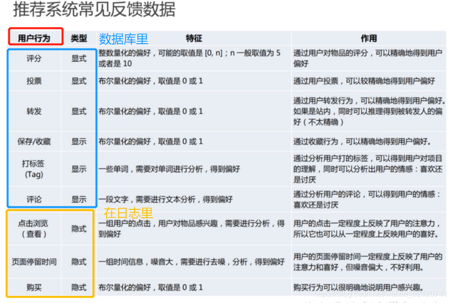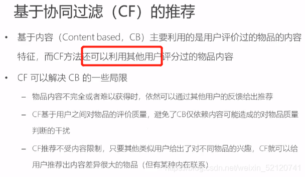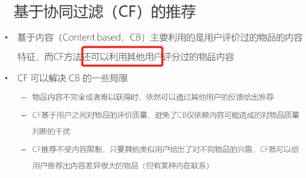 CF中,用户的行为(评分),不仅表示用户的兴趣(评过分),还可以反映物品的质量(分值高低)。但CF无法解决冷启动的问题,因此实践中都是混合起来用的。