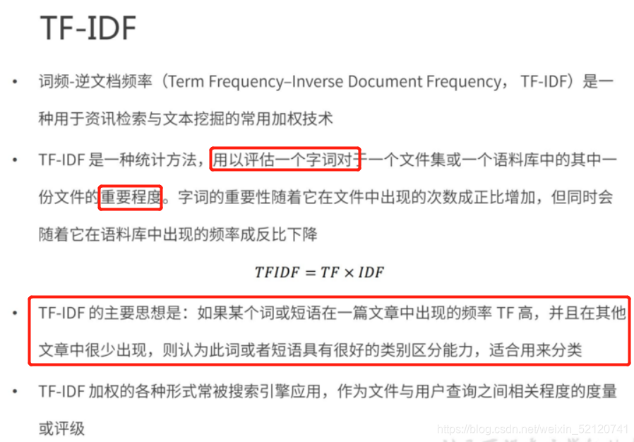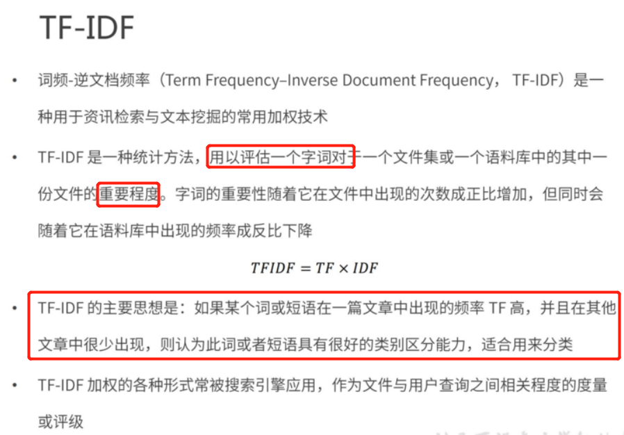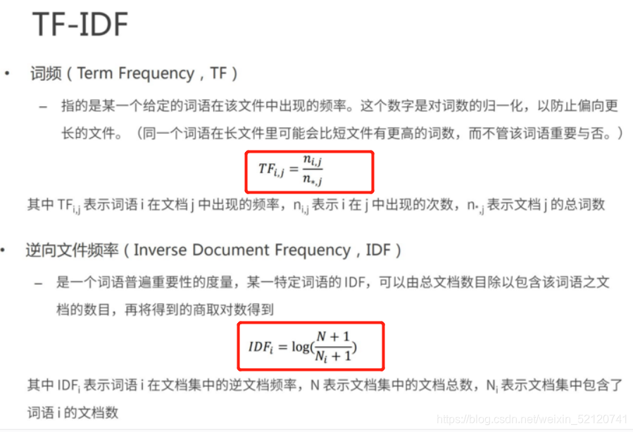 def computeIDF( wordDictList ):# 用一个字典对象保存idf结果,每个词作为key,初始值为0idfDict = dict.fromkeys(wordDictList[0], 0)N = len(wordDictList)import mathfor wordDict in wordDictList:# 遍历字典中的每个词汇,统计Nifor word, count in wordDict.items():if count > 0:# 先把Ni增加1,存入到idfDictidfDict[word] += 1# 已经得到所有词汇i对应的Ni,现在根据公式把它替换成为idf值for word, ni in idfDict.items():idfDict[word] = math.log10( (N+1)/(ni+1) )return idfDictidfs = computeIDF( [wordDictA, wordDictB] )