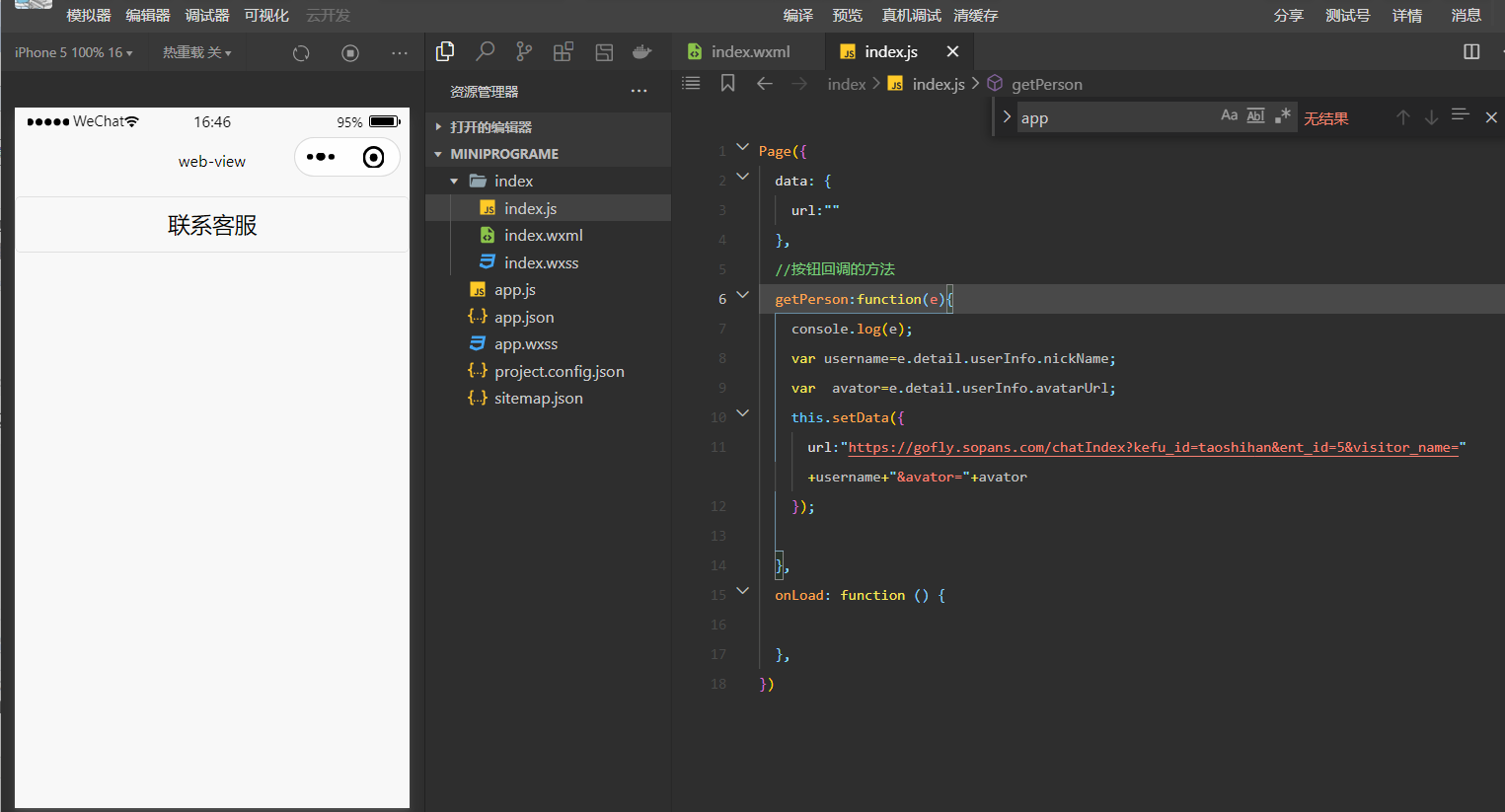 Page({data: {url:""},//按钮回调的方法getPerson:function(e){console.log(e);var username=e.detail.userInfo.nickName;var avator=e.detail.userInfo.avatarUrl;this.setData({url:"https://gofly.sopans.com/chatIndex?kefu_id=taoshihan&ent_id=5&visitor_name="+username+"&avator="+avator});},onLoad: function () {},