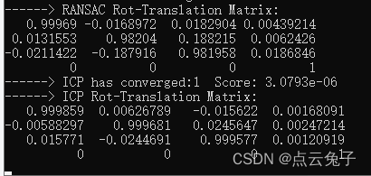 // plotter->clearPlots();clock_t tik_descriptors_b = clock();pcl::io::savePCDFileASCII(datastream::filename_desc_cshot_src, *rCSHOTDesc_src);pcl::io::savePCDFileASCII(datastream::filename_desc_cshot_tar, *rCSHOTDesc_tar);// ++++++++++++++++++++++++++++++++++++++++++++++++++++++++++++++++++++++++++++++++++++++++++++++++++++++++++++++++++++++++++++++++++// Coarse Registration: RANSAC// ++++++++++++++++++++++++++++++++++++++++++++++++++++++++++++++++++++++++++++++++++++++++++++++++++++++++++++++++++++++++++++++++++// RANSAC Coarse Regisrationclock_t tik_ransac_a = clock();pcl::SampleConsensusInitialAlignment scia;PointCloud::Ptr sac_result(new PointCloud);// RANSAC setupscia.setInputSource(iKeypoints_src);scia.setInputTarget(iKeypoints_tar);scia.setSourceFeatures(rCSHOTDesc_src);scia.setTargetFeatures(rCSHOTDesc_tar);scia.setMaximumIterations(sacparm::max_iterations);scia.setNumberOfSamples(sacparm::num_sampels);scia.setCorrespondenceRandomness(sacparm::corresp_randomness);//scia.setMaxCorrespondenceDistance(sacparm::max_corresp_dist);//scia.setInlierFraction(sacparm::inlier_fraction);//scia.setSimilarityThreshold(sacparm::similarity_threshold)scia.align(*sac_result);std::cout << "------> RANSAC has converged:" << scia.hasConverged() << " Score: " << scia.getFitnessScore() << std::endl;Eigen::Matrix4f sac_rotTrans;sac_rotTrans = scia.getFinalTransformation();std::cout << "------> RANSAC Rot-Translation Matrix:" << std::endl;std::cout << sac_rotTrans << std::endl;clock_t tik_ransac_b = clock();pcl::io::savePCDFileASCII(datastream::filename_SAC_trans_src, *sac_result);// ++++++++++++++++++++++++++++++++++++++++++++++++++++++++++++++++++++++++++++++++++++++++++++++++++++++++++++++++++++++++++++++++++// Fine Registration: ICP// ++++++++++++++++++++++++++++++++++++++++++++++++++++++++++++++++++++++++++++++++++++++++++++++++++++++++++++++++++++++++++++++++++clock_t tik_icp_a = clock();// ICP regisraterpcl::IterativeClosestPoint icp;PointCloud::Ptr icp_result(new PointCloud);// ICP setupicp.setInputSource(iKeypoints_src);icp.setInputTarget(iCloud_tar);icp.setMaxCorrespondenceDistance(icpparm::max_corresp_dist);icp.setMaximumIterations(icpparm::max_iterations);icp.setTransformationEpsilon(icpparm::trans_epsilon);icp.setEuclideanFitnessEpsilon(icpparm::euclidean_fitness_epsilon);icp.align(*icp_result, sac_rotTrans);std::cout << "------> ICP has converged:" << icp.hasConverged() << " Score: " << icp.getFitnessScore() << std::endl;clock_t tik_icp_b = clock();Eigen::Matrix4f icp_rotTrans;icp_rotTrans = icp.getFinalTransformation();std::cout << "------> ICP Rot-Translation Matrix:" << std::endl;std::cout << icp_rotTrans << std::endl;pcl::transformPointCloud(*iCloud_src, *icp_result, icp_rotTrans);pcl::io::savePCDFileASCII(datastream::filename_SAC_ICP_trans_src, *icp_result);// ++++++++++++++++++++++++++++++++++++++++++++++++++++++++++++++++++++++++++++++++++++++++++++++++++++++++++++++++++++++++++++++++++// Visualization// ++++++++++++++++++++++++++++++++++++++++++++++++++++++++++++++++++++++++++++++++++++++++++++++++++++++++++++++++++++++++++++++++++visualize_registration(iCloud_src, iCloud_tar, icp_result);// ++++++++++++++++++++++++++++++++++++++++++++++++++++++++++++++++++++++++++++++++++++++++++++++++++++++++++++++++++++++++++++++++++// Pipeline Evaluation// ++++++++++++++++++++++++++++++++++++++++++++++++++++++++++++++++++++++++++++++++++++++++++++++++++++++++++++++++++++++++++++++++++// Evaluate Time Coststd::cout << "------> Total time : " << (double)(tik_icp_b - tik_normals_a) / (double)CLOCKS_PER_SEC << " s" << std::endl;std::cout << "------> ISS3D time : " << (double)(tik_detect_b - tik_detect_a) / (double)CLOCKS_PER_SEC << " s" << std::endl;std::cout << "------> Normals time : " << (double)(tik_normals_b - tik_normals_a) / (double)CLOCKS_PER_SEC << " s" << std::endl;std::cout << "------> CSHOT time : " << (double)(tik_descriptors_b - tik_descriptors_a) / (double)CLOCKS_PER_SEC << " s" << std::endl;std::cout << "------> RANSAC time : " << (double)(tik_ransac_b - tik_ransac_a) / (double)CLOCKS_PER_SEC << " s" << std::endl;std::cout << "------> ICP time : " << (double)(tik_icp_b - tik_icp_a) / (double)CLOCKS_PER_SEC << " s" << std::endl;// Evaluate RMSEpcl::registration::CorrespondenceEstimation corre;corre.setInputSource(icp_result);corre.setInputTarget(iCloud_tar);pcl::Correspondences all_corre;corre.determineReciprocalCorrespondences(all_corre);float sum = 0.0, sum_x = 0.0, sum_y = 0.0, sum_z = 0.0, rmse, rmse_x, rmse_y, rmse_z;std::vector co;for (size_t j = 0; j < all_corre.size(); j++) {sum += all_corre[j].distance;co.push_back(all_corre[j].distance);sum_x += pow((iCloud_tar->points[all_corre[j].index_match].x - icp_result->points[all_corre[j].index_query].x), 2);sum_y += pow((iCloud_tar->points[all_corre[j].index_match].y - icp_result->points[all_corre[j].index_query].y), 2);sum_z += pow((iCloud_tar->points[all_corre[j].index_match].z - icp_result->points[all_corre[j].index_query].z), 2);}rmse = sqrt(sum / all_corre.size()); // Total RMSE on XYZrmse_x = sqrt(sum_x / all_corre.size()); // RMSE on X-axisrmse_y = sqrt(sum_y / all_corre.size()); // RMSE on X-axisrmse_z = sqrt(sum_z / all_corre.size()); // RMSE on X-axisstd::vector::iterator max = max_element(co.begin(), co.end()); // Get the Farthest cloud point pairstd::vector::iterator min = min_element(co.begin(), co.end()); // Get the Nearest cloud point pairstd::cout << "------> Number of correspondent points: " << all_corre.size() << std::endl;std::cout << "------> Maximum distance: " << sqrt(*max) * 100 << "cm" << std::endl;std::cout << "------> Minimum distance: " << sqrt(*min) * 100 << "cm" << std::endl;std::cout << "------> Total RMSE :" << rmse << " m" << std::endl;std::cout << "------> RMSE on x-axis :" << rmse_x << " m" << std::endl;std::cout << "------> RMSE on y-axis :" << rmse_y << " m" << std::endl;std::cout << "------> RMSE on z-axis :" << rmse_z << " m" << std::endl;// Record the pipeline evaluationofstream fout(datastream: