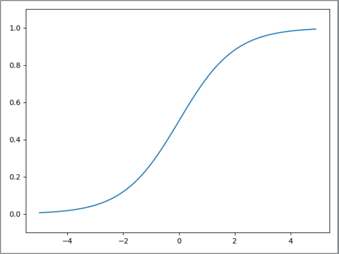 from matplotlib import pyplot as pltdef sigmoid(x):return 1 / (1 + np.exp(-x))if __name__ == "__main__":# 在-5.0到5.0的范围内,以0.1位单位,生成Numpy数组array([-5.0, -4.9, ... , 4.8, 4.9])x = np.arange(-5.0, 5.0, 0.1)y = sigmoid(x)plt.plot(x, y)plt.ylim(-0.1, 1.1) # 指定y轴的范围plt.show()