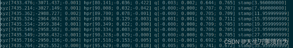 {if(item.base.id != 1)return;msgEgoPose.header.seq++;msgEgoPose.header.stamp.sec = simTime;msgEgoPose.header.stamp.nsec = (simTime - msgEgoPose.header.stamp.sec)*1000000000;msgEgoPose.header.frame_id = "base_link";msgEgoPose.pose.position.x = item.base.pos.x;msgEgoPose.pose.position.y = item.base.pos.y;msgEgoPose.pose.position.z = item.base.pos.z;tf::Quaternion q = tf::createQuaternionFromRPY(item.base.pos.r, item.base.pos.p, item.base.pos.h);msgEgoPose.pose.orientation.x = q.x();msgEgoPose.pose.orientation.y = q.y();msgEgoPose.pose.orientation.z = q.z();msgEgoPose.pose.orientation.w = q.w();if(msgEgoPose.header.seq % 100 == 0) {fprintf(stderr, "xyz[%6.3f;%6.3f;%6.3f] hpr[%6.3f;%6.3f;%6.3f] q[%6.3f;%6.3f;%6.3f;%6.3f] stamp[%d.%d]\n",item.base.pos.x,item.base.pos.y,item.base.pos.z,item.base.pos.h * 180.0/M_PI,item.base.pos.p * 180.0/M_PI,item.base.pos.r * 180.0/M_PI,msgEgoPose.pose.orientation.x,msgEgoPose.pose.orientation.y,msgEgoPose.pose.orientation.z,msgEgoPose.pose.orientation.w,msgEgoPose.header.stamp.sec,msgEgoPose.header.stamp.nsec);}