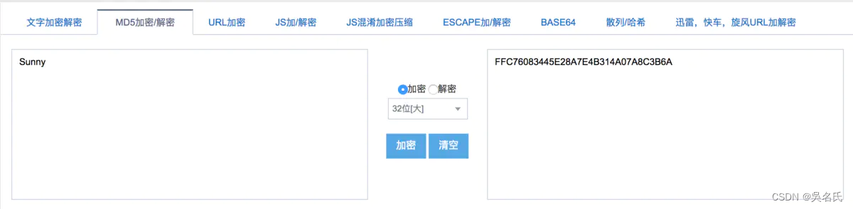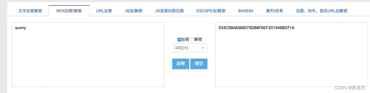 这边我们还是以md5为例子,给大家展示一下。这里可以给大家推荐一个比较好用的在线md5加密的工具:站长工具。我们先生成一个sunny的md5结果看看,这里选择生成32位大写字母作为结果: