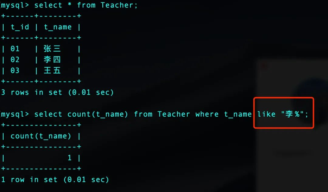 select count(t_name) from Teacher where t_name like "李%"; -- 通配符