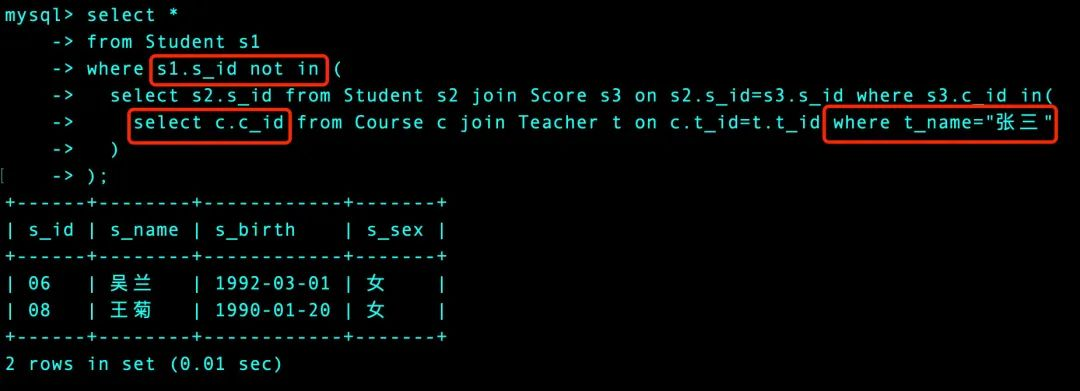 where s_id not in ( -- 2.通过学号取反:学号不在张三老师授课的学生的学号中select s_id from Score Sjoin Course Con S.c_id = C.c_idwhere C.t_id=(select t_id from Teacher where t_name ="张三") -- 1.查询张三老师的课程