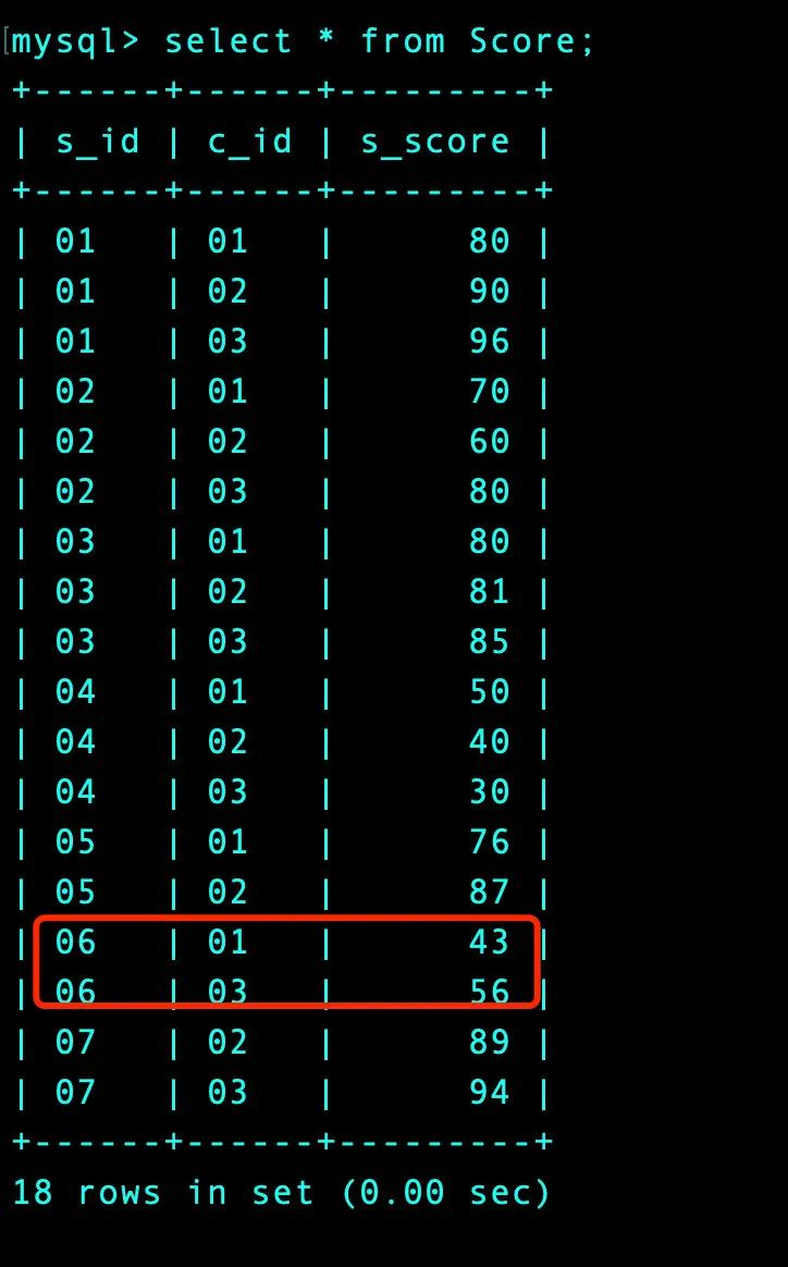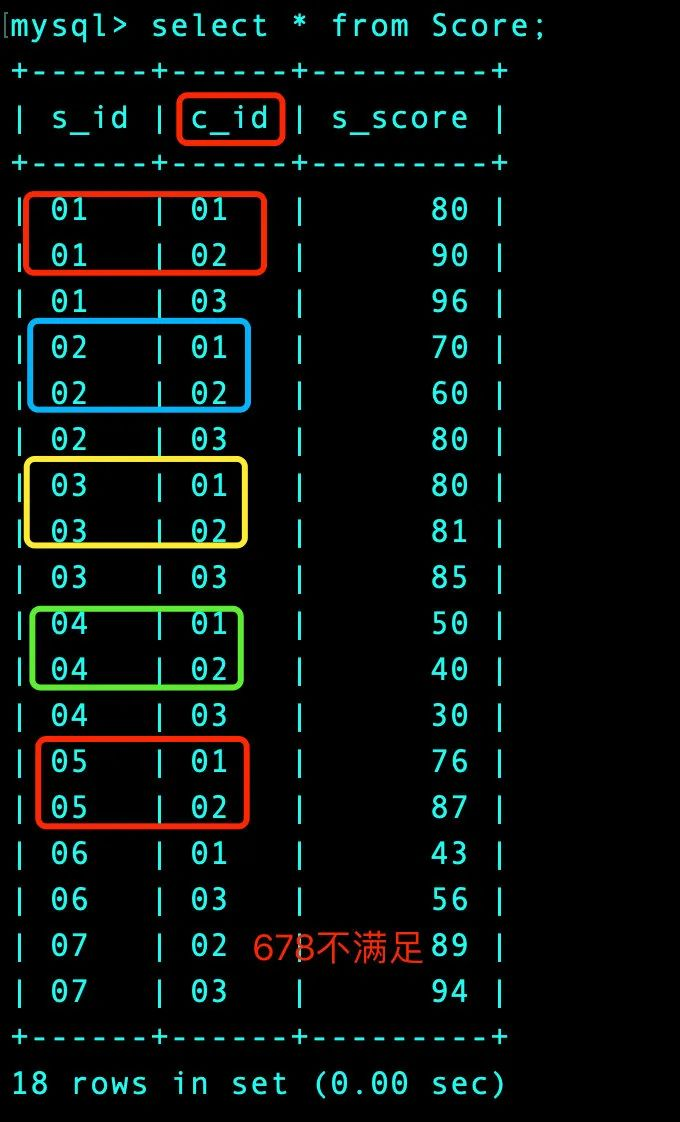 先从Score表中看看哪些人是满足要求的:01-05同学是满足的