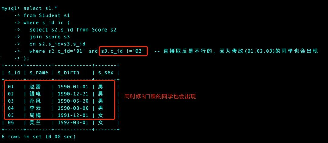 where s_id in (select s2.s_id from Score s2join Score s3on s2.s_id=s3.s_idwhere s2.c_id='01' and s3.c_id !='02' -- 直接取反是不行的,因为修改(01,02,03)的同学也会出现