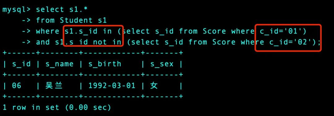 select * from Student where s_id in (select s_id from Score where c_id='01' -- 修过01课程的学号and s_id not in (select s_id -- 同时学号不能在修过02课程中出现from Score where c_id='02')