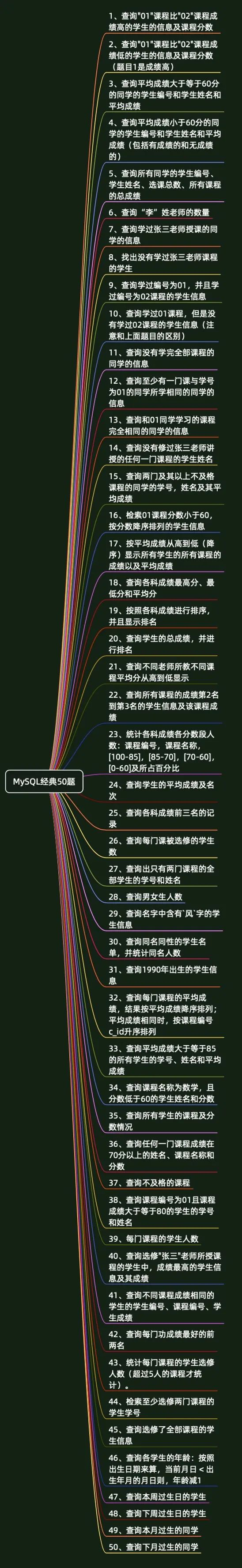 相信大多学习了 Mysql 数据库语言的同学都会上网找练习来练手,而大部分的人肯定知道有一篇 Mysql 经典练习题50题的帖子,上面的题目基本上涵盖了 Mysql 查询语句的关键知识点。
