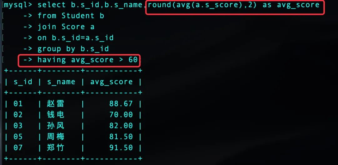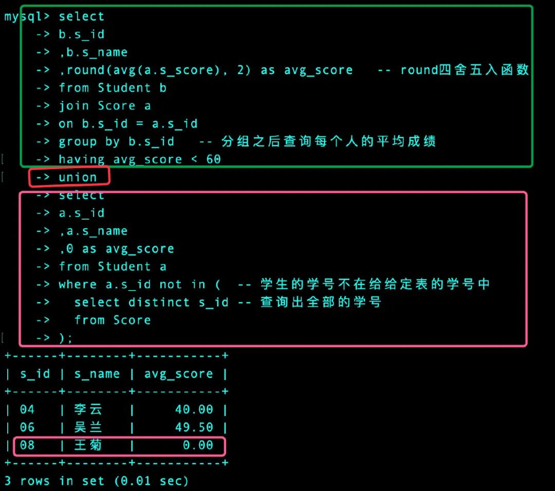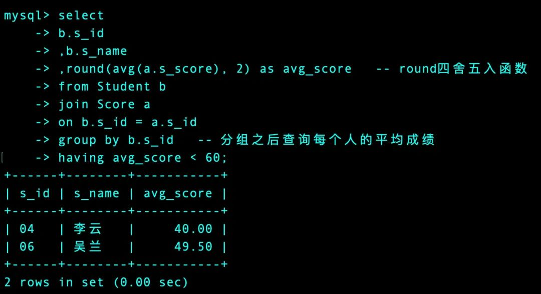 HAVING avg_score < 60 or avg_score is null; -- 最后的NULL判断