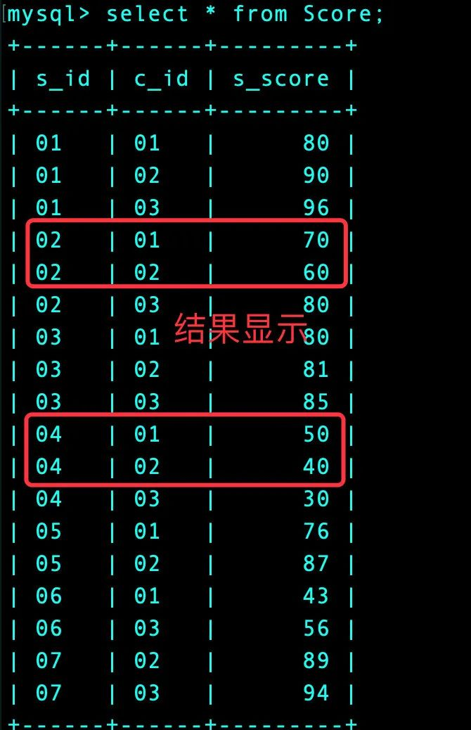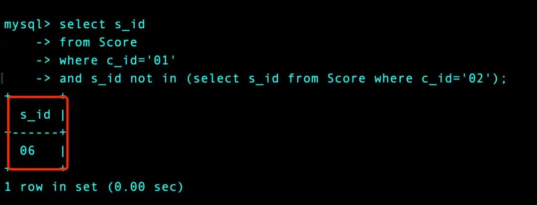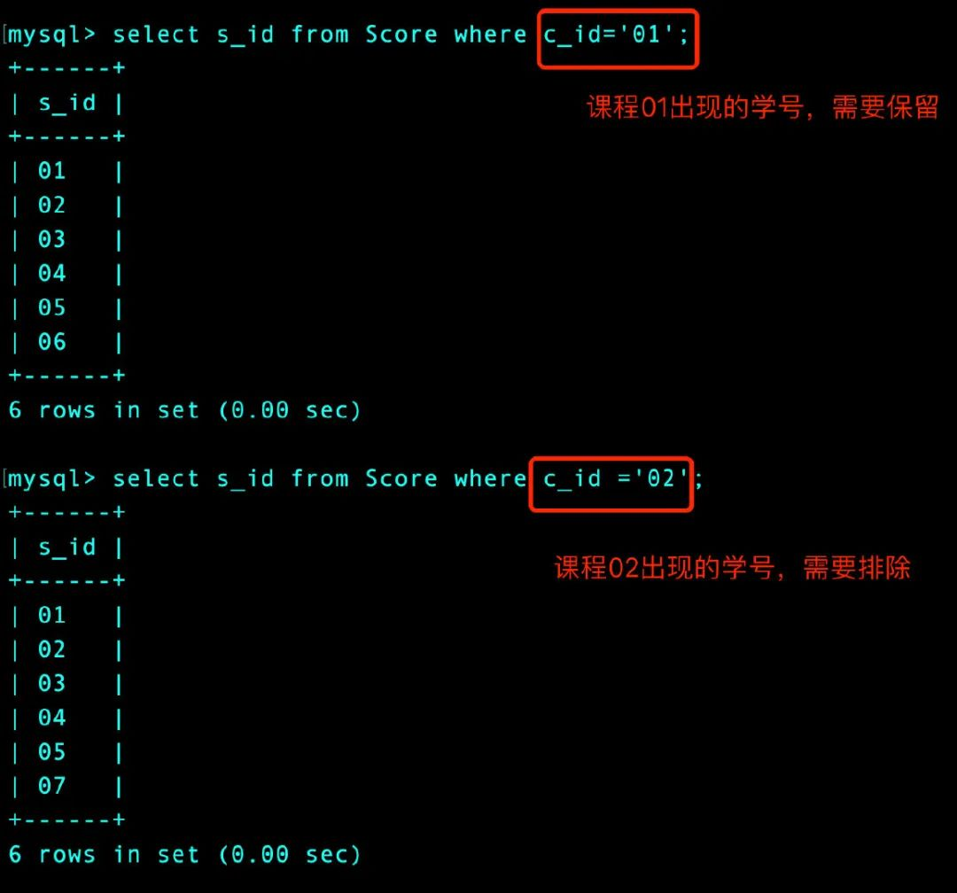where s_id not in ( -- 直接将上面一题的结果全部排出,导致那些没有学过01课程的学生也出现了:07,08select s2.s_id from Score s2join Score s3on s2.s_id=s3.s_idwhere s2.c_id='01' and s3.c_id ='02'