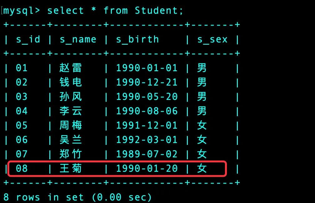 insert into Student values('08' , '王菊' , '1990-01-20' , '女');