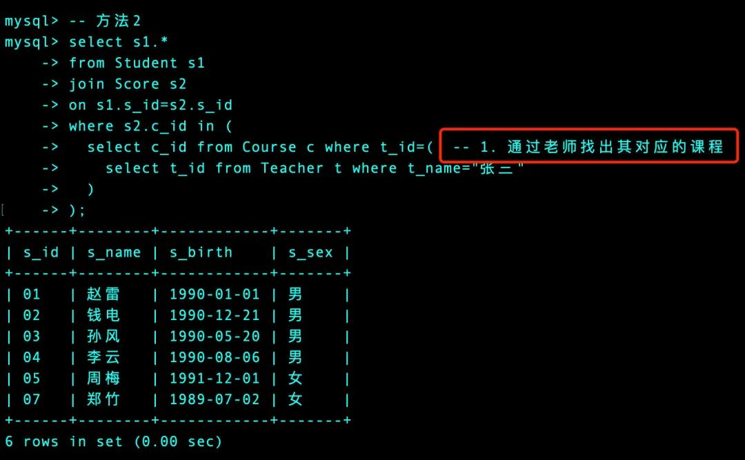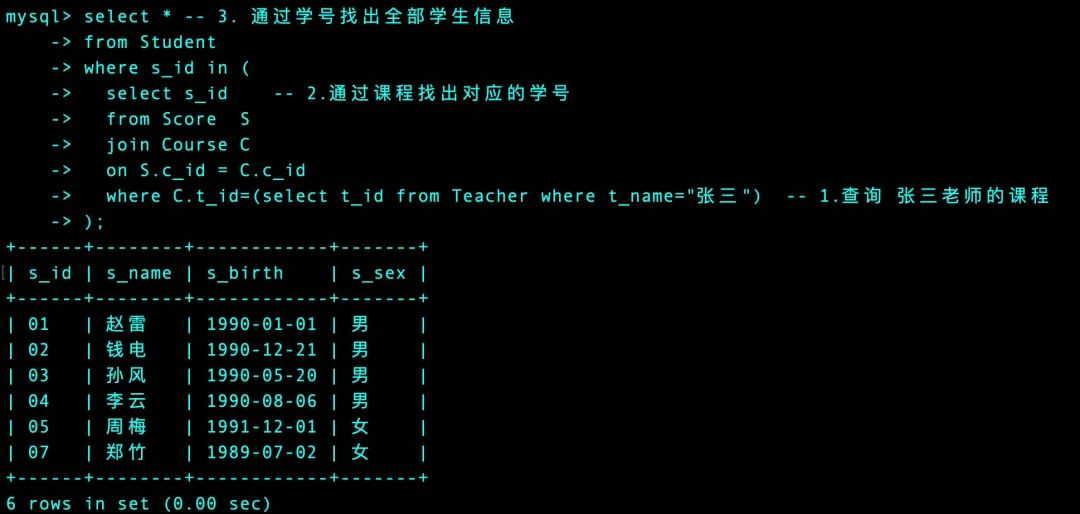 where s_id in (select s_id -- 2.通过课程找出对应的学号from Score Sjoin Course Con S.c_id = C.c_id -- 课程表和成绩表where C.t_id=(select t_id from Teacher where t_name="张三") -- 1.查询张三老师的课程