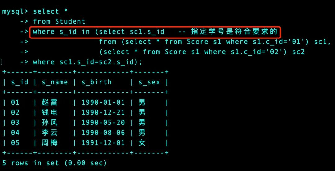 where s_id in (select sc1.s_id -- 指定学号是符合要求的from (select * from Score s1 where s1.c_id='01') sc1,(select * from Score s1 where s1.c_id='02') sc2