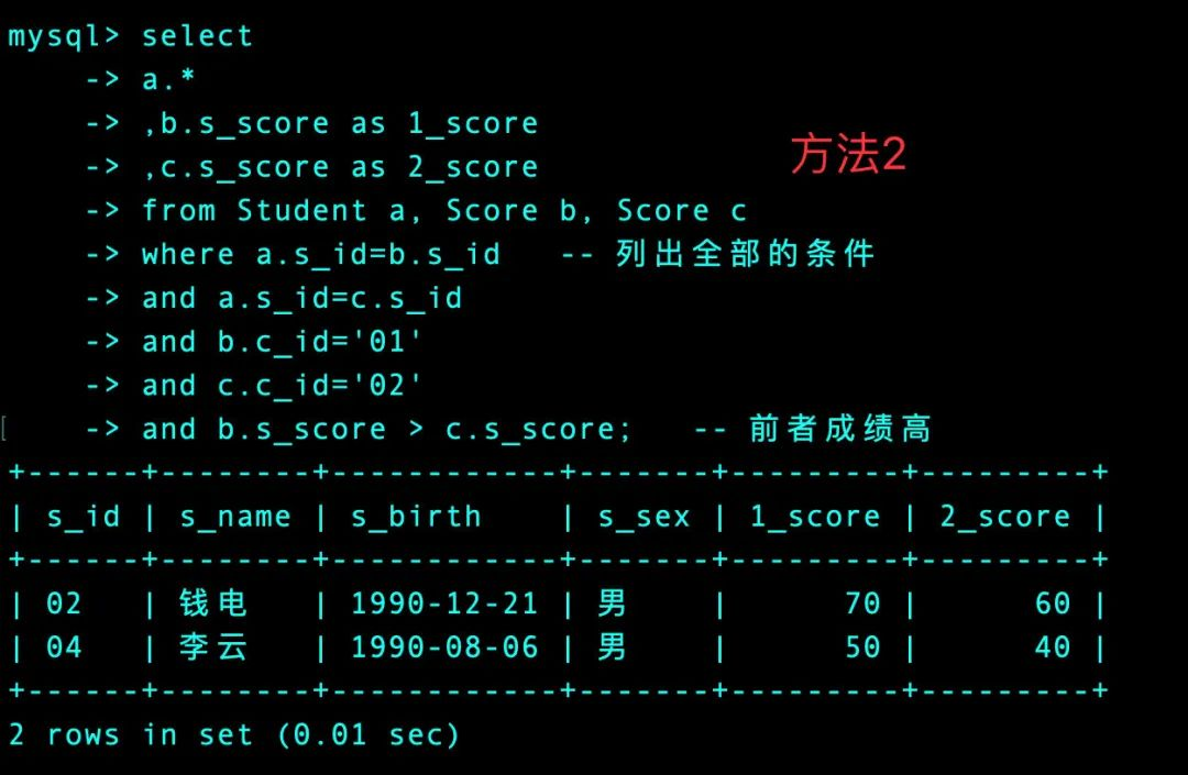 where b.s_score > c.s_score; -- 判断条件-- 方法2:直接使用where语句
