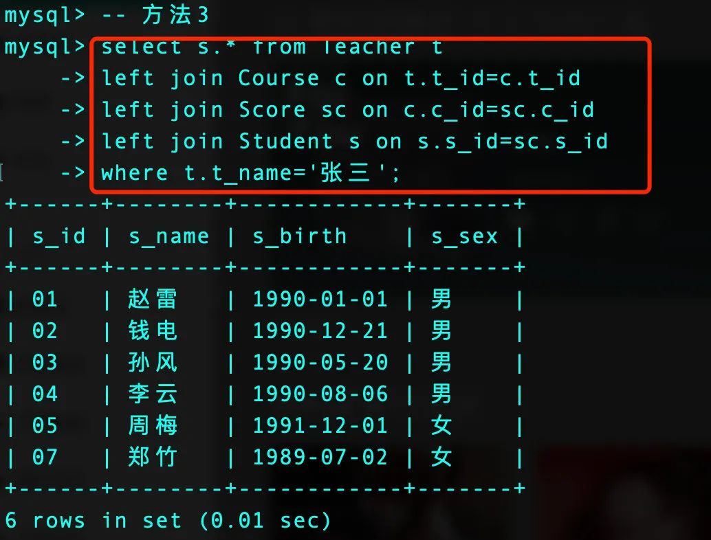-- 方法1:通过张三老师的课程的学生来查找;自己的方法