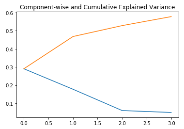 plt.plot(range(4), pca.explained_variance_ratio_)plt.plot(range(4), np.cumsum(pca.explained_variance_ratio_))plt.title(“Component-wise and Cumulative Explained Variance”)