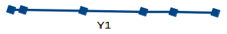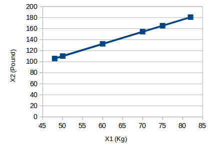 其中横坐标X1的单位为“千克”,纵坐标X2的单位为“磅”。可以发现,虽然是两个变量,但它们传达的信息是一致的,即物体的重量。所以我们只需选用其中的一个就能保留原始意义,把2维数据压缩到1维(Y1)后,上图就变成: