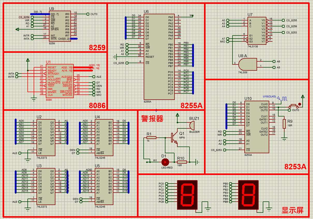 基于8086计算机系统,利用如上图的8254,8255,8259 设计利用中断原理的30分钟警报系统;(需要的辅助原件可以 自己根据需要添加,如晶振等)。