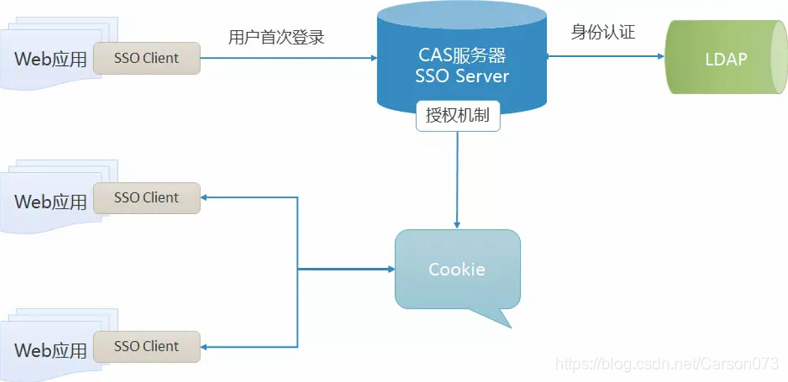 CAS Server:CAS Server 负责完成对用户的认证工作 , 需要独立部署 , CAS Server 会处理用户名 / 密码等凭证(Credentials)。