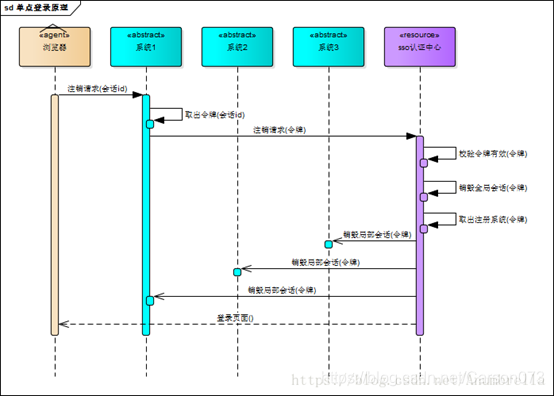 既然有登陆那么就自然有注销,单点登录也要单点注销,在一个子系统中注销,所有子系统的会话都将被销毁。原理图如下: