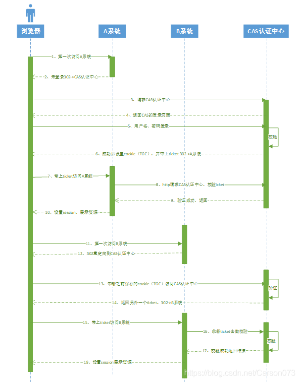 16:B系统获取ticket去CAS认证中心验证是否有效。