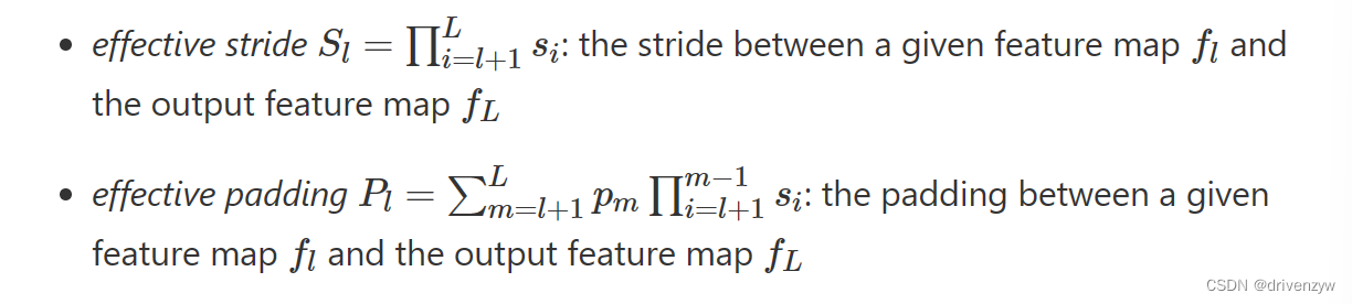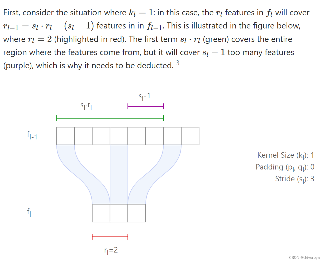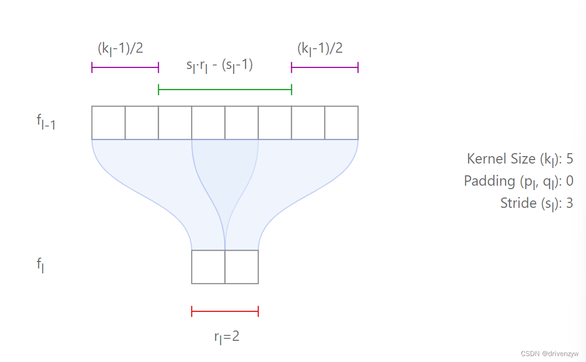 fl-1是输入层,卷积之后得到了fl层,由图中可以看到,fl-1层中kl个格子和fl层中的一个格子相关联(蕴含相同的信息),所以说rl-1(fl-1的感受野)是kl