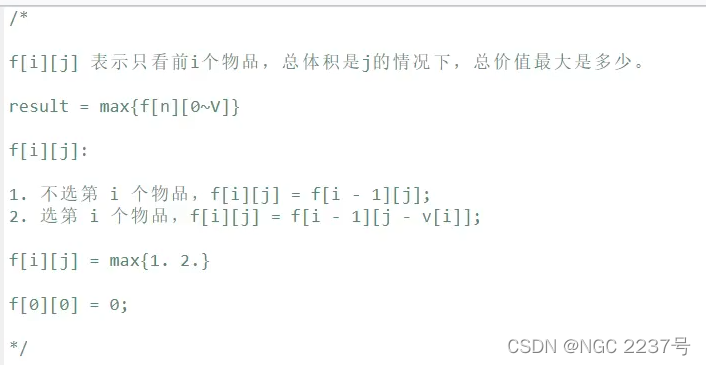 这个方程非常重要,基本上所有跟背包相关的问题的方程都是由它衍生出来的。所以有必要将它详细解释一下:“将前i件物品放入容量为v的背包中”这个子问题,若只考虑第i件物品的策略(放或不放),那么就可以转化为一个只牵扯前i-1件物品的问题。如果不放第i件物品,那么问题就转化为“前i-1件物品放入容量为v的背包中”;如果放第i件物品,那么问题就转化为“前i-1件物品放入剩下的容量为v-c[i]的背包中”,此时能获得的最大价值就是f [i-1][v-c[i]]再加上通过放入第i件物品获得的价值w[i]。