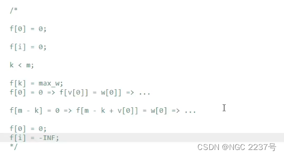 若题目要求装满背包,即将物品恰装入一个容量为m的背包中,只需要将初始化条件改一改即可,----将dp数组初始化为负无穷,f[0]=0,即可确保状态一定是从0转移过来的。
