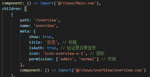 首先在路由之中添加meta字段,并在其中添加permission(该字段名可自定义)数组存放允许访问的角色名,如下图所示: