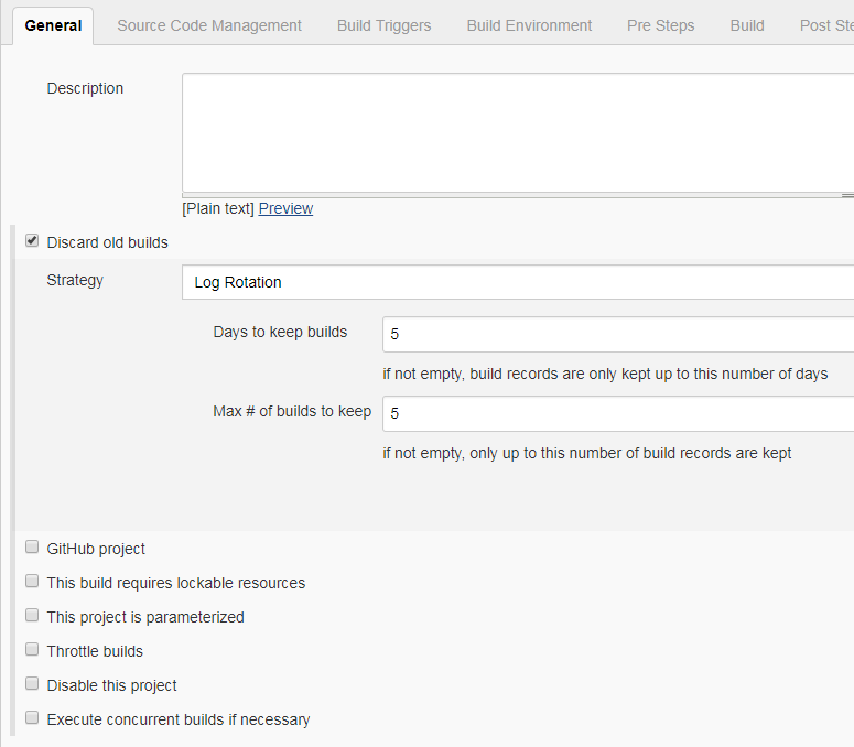 在General,勾选 Discard old builds,可以设置最多保留构建文件多少天,和最多保留多少个构建文件,不然每次构建生成的文件都会保留,占用磁盘空间。
