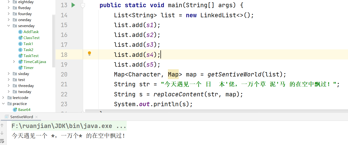 /*** 替换内容的方法** @param str 字符串* @return 返回替换之后的字符串*/private static String replaceContent(String str, Map map) {//下标指针int index;//是否有敏感词汇统计int count;StringBuilder sb = new StringBuilder();//遍历字符串for (int i = 0; i < str.length(); i += index) {index = 0;count = 0;//将封装好敏感词汇的map赋值给map1Map map1 = map;//判断map1中是否包含敏感词while (map1.containsKey(str.charAt(i + index))) {//包含敏感词就将str.charAt(i + index)(敏感词)(key)所对应的value赋值给map1map1 = map1.get(str.charAt(i + index));//下标指针加一index++;//判断map1中是否包含结束符if (map1.containsKey('\t')) {//包含结束符代表含有敏感词汇count++;break;}//判断下标指针加一之后是否为特殊字符while (chars.contains(str.charAt(i + index))) {//是特殊字符则下标指针加一index++;}}if (count != 0) {//包含敏感词汇追加*sb.append('*');//i变成(i+下标指针)} else {//不包含敏感词汇追加该字符sb.append(str.charAt(i));//下标指针回到1index = 1;//i变成(i+下标指针)}}return sb.toString();}