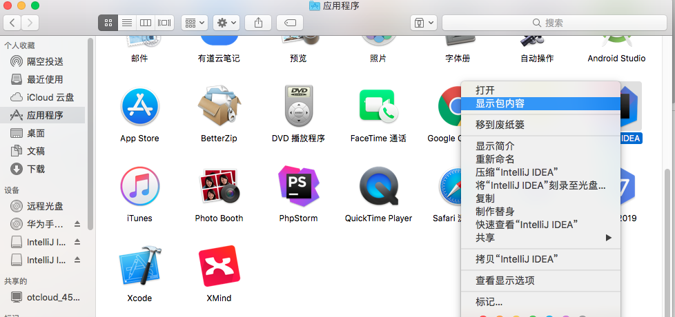 在Finder应用程序文件夹中右击IntelliJ IDEA,“显示包内容”