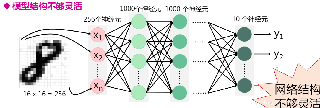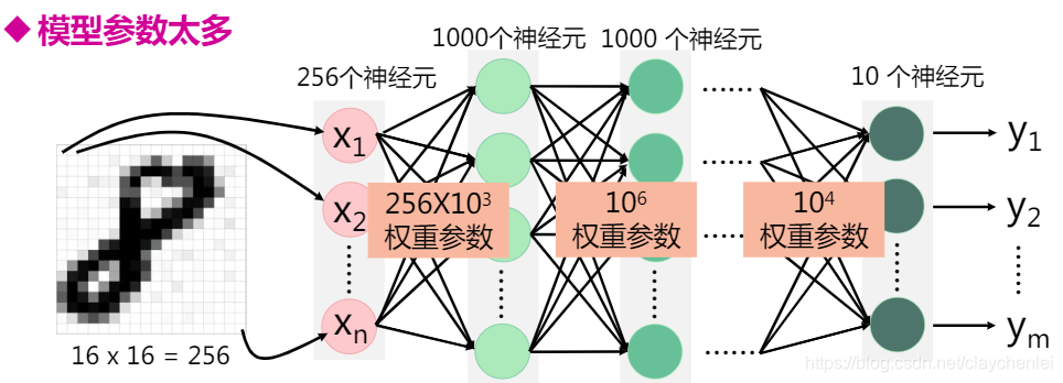 例如:输入为16 x 16 的图片,输入层为256个神经元,隐藏层每层1000个神经元,输出层10个。假设共5层,则共需要学习(256*10^3+10^6+10^6+10^4 )个,w再加(1000+1000+1000+10)个b。这是十分大运算量。如果输入为100*100的图片或者更大的图片呢?如果网络的层数为十层呢?