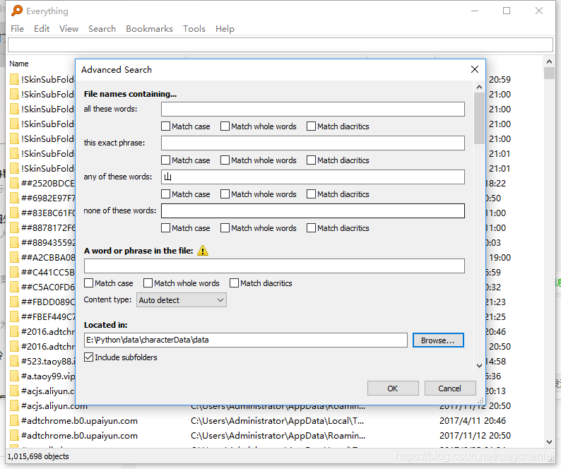 因为几乎每个文件夹都有含中文的图片,一个个实在费时间,所以用everything 高级搜索