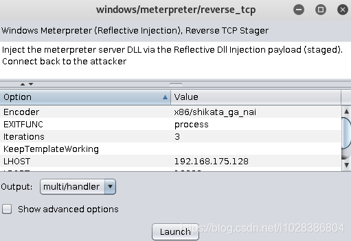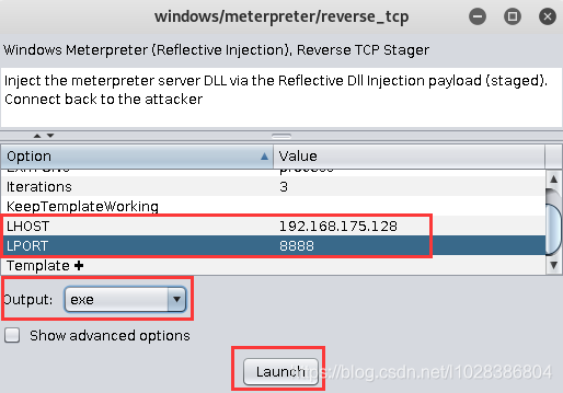 这里,设置我们的LHOST和LPORT,并将Output设置为exe,最后单击Launch按钮导出生成的exe文件。