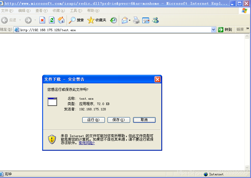 在靶机的浏览器地址栏输入:http://192.168.175.128/test.exe下载test.exe文件