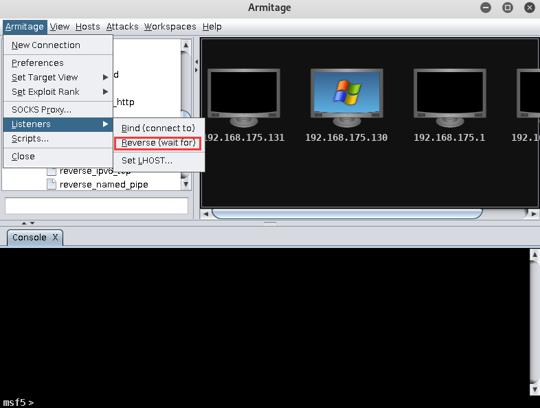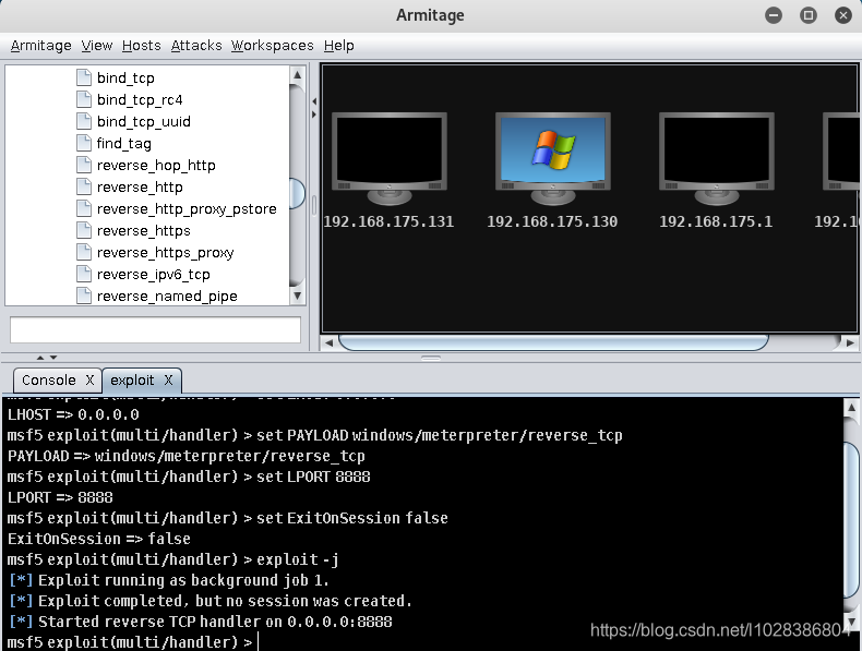 在Armitage的左上角依次选择payload->windows->meterpreter->reverse_tcp