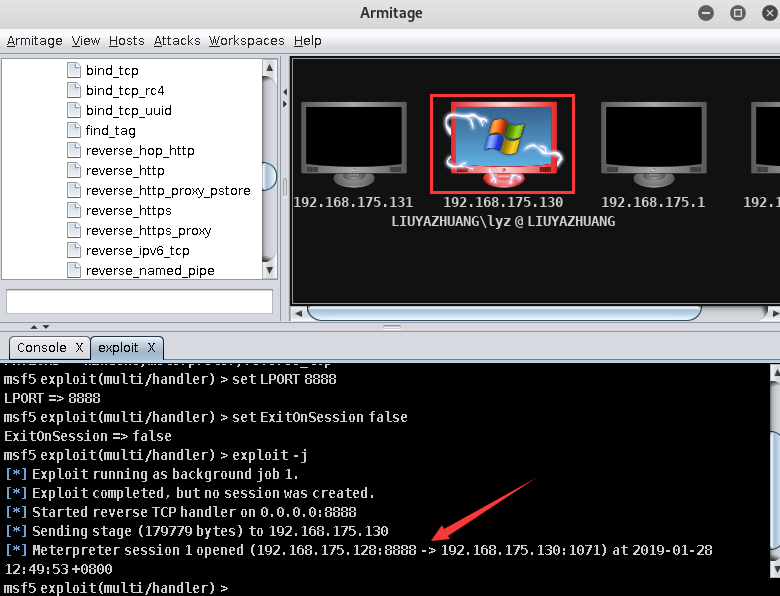 此时,切换到Armitage,我们在输出日志中看到打开了一个Meterpreter session,如下图: