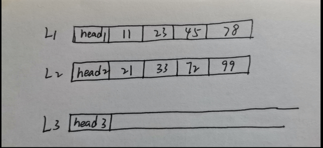 如图所示呢!L1,L2为两个有序的单链表(带头结点哦!),L3呢是我们新建的一个头结点,用来连接合并后的结果,首先比较L1的第一个节点的data与L2第一个节点的data,若L1的小于L2的 ,则将L3的头结点指向L1的第一个节点,同时将L3往后挪一个位置,然后再进行比较,比较到最后,谁先到结尾,那么就直接将没有到结尾的,把他后面的节点统统接到L3的尾巴后面即可!具体的操作代码如下: