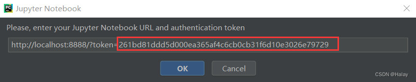 打开刚刚成功启动的 jupyter notebook ,可以看到其中存在: http://localhost:8888/?token= 的字样,将其后字符序列复制到在 Pycharm 中的框内:(这个字符序列伴随着 jupyter notebook 的开启与关闭会发生变化)