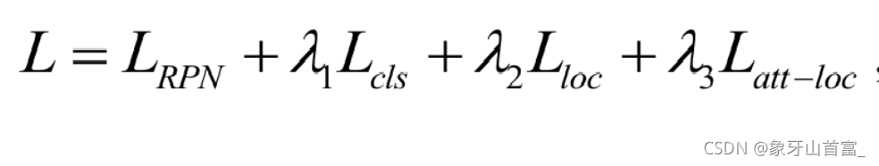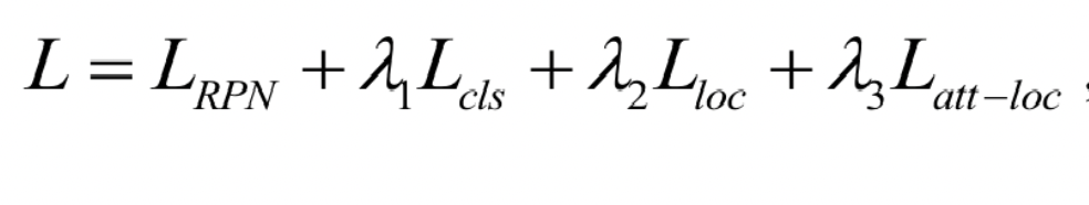 其中λ 1、λ 2和λ 3是控制损失函数的超参数,L RPN、L cls和L loc分别是RPN 、目标分类和目标定位的损失函数。L cls是 ( C +1) 个类别上的 softmax 交叉熵损失,即对象类和背景的数量。我们将用来学习目标的边界框位置 ( x, y, w, h )的smothed L1 损失记作L loc。在L att -loc , sigmoid 交叉熵损失用于制作目标定位的注意力图以激活目标的整个区域。我们简单地在方程中设置λ 1 = λ 2 = λ 3 = 1 ,并通过反向传播共同学习提议的网络。