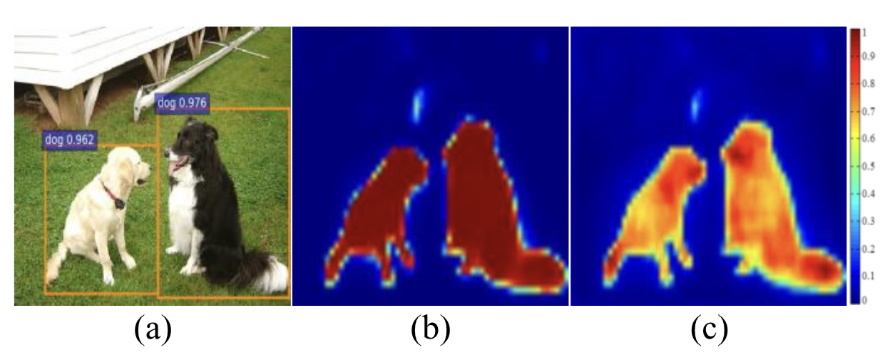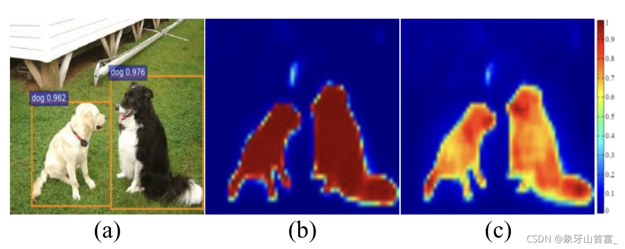 (a) 是在 PASCAL VOC 2007测试集上的检测结果示例。(b) 目标定位和 (c) 目标分类的建议注意力图示例。目标定位的注意力图是在整个图像区域上激活的,而目标分类的注意力图是在图像的一部分上激活的。