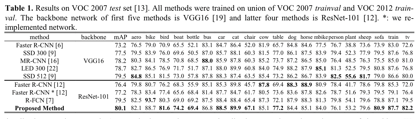 表1 VOC 2007 测试集的结果 。所有方法都在 VOC 2007 trainval 和 VOC 2012 trainval 的联合上训练。前五种方法的骨干网络是 VGG16 ,后四种方法是 ResNet-101 。
