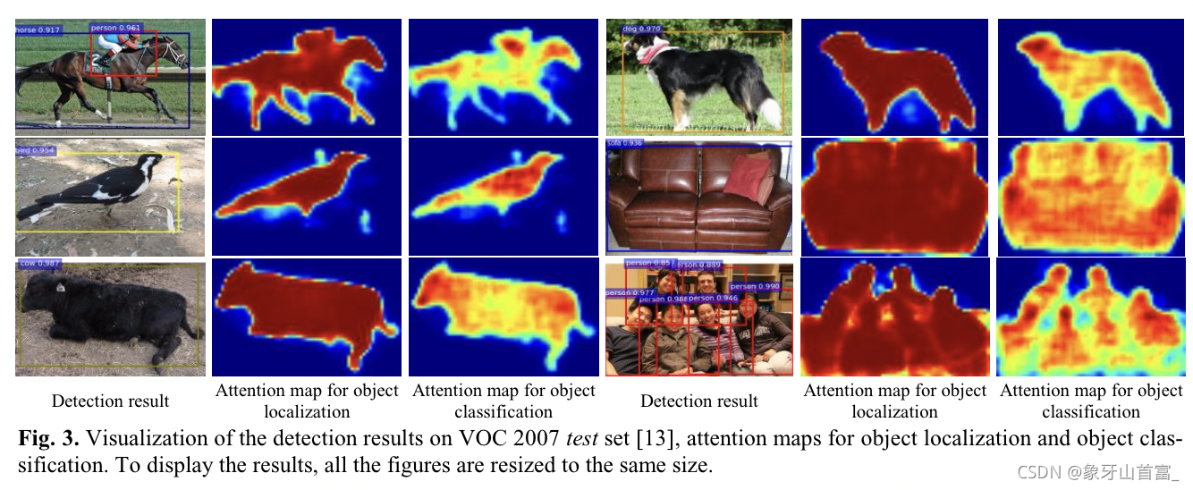 VOC 2007测试集上检测结果的可视化,用于目标定位和目标分类的注意力图。为了显示结果,所有图形都被调整为相同的大小。