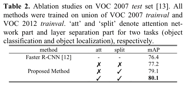 接下来,我们进行了消融研究,以证明图2中注意力网络部分和层分离部分的有效性。如表2所示。我们比较了 Faster R-CNN 。我们重新实现了Faster R-CNN ,它没有注意力网络部分和层分离部分。如表2所示,当只有层分离部分时,性能为79.1 mAP。与Faster R-CNN 相比,它提高了 2.7 mAP和 1.9 mAP 与重新实现的结果相比。当额外引入注意力网络部分时,性能为 80.1 mAP,这是 1.0 mAP 的额外改进。通过分离层来执行这两个任务,性能得到了提高。此外,注意力网络通过根据两个任务强调区域来提高性能。