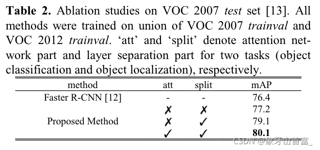 VOC 2007 测试集的消融研究 。所有方法都在 VOC 2007 trainval 和 VOC 2012 trainval 的联合上训练。'att' 和 'split' 分别表示两个任务(目标分类和目标定位)的注意力网络部分和层分离部分。