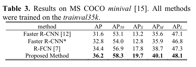 为了展示所提出的目标检测网络的有效性,我们还对 MS COCO 数据集进行了研究。所有模型都在训练集和验证图像子集 ( trainval35k )的联合上进行了训练。我们评估了 COCO minival 上的性能。表3显示了检测结果。由于我们提出的方法是两阶段目标检测网络,我们与最先进的两阶段目标检测网络进行了比较,Faster R-CNN 和 R-FCN。如表3所示,所提出的方法实现了 36.2 AP。它分别比 Faster R-CNN 和 R-FCN 高 4.6 AP 和 1.8 AP。所有指标(即 AP 50、 AP S、AP M, 和 AP L ) 至少提高了 0.8 个点。它还验证了所提出的目标检测网络提高了整体物体检测精度。