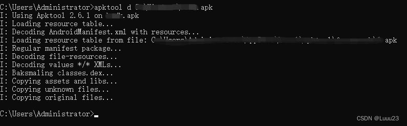 输入命令:apktool d xxx.apk 执行,出现以下内容代表执行成功